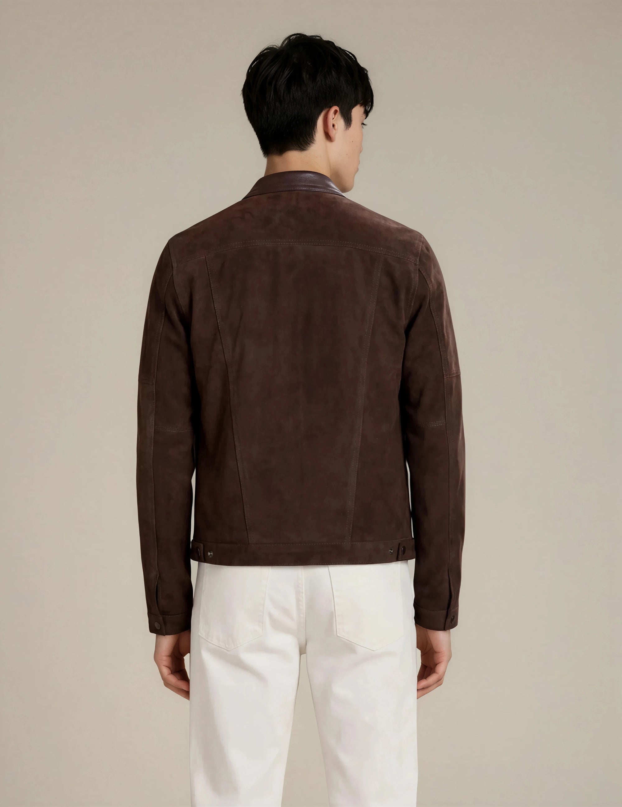 Man wearing a dark brown goat suede biker jacket