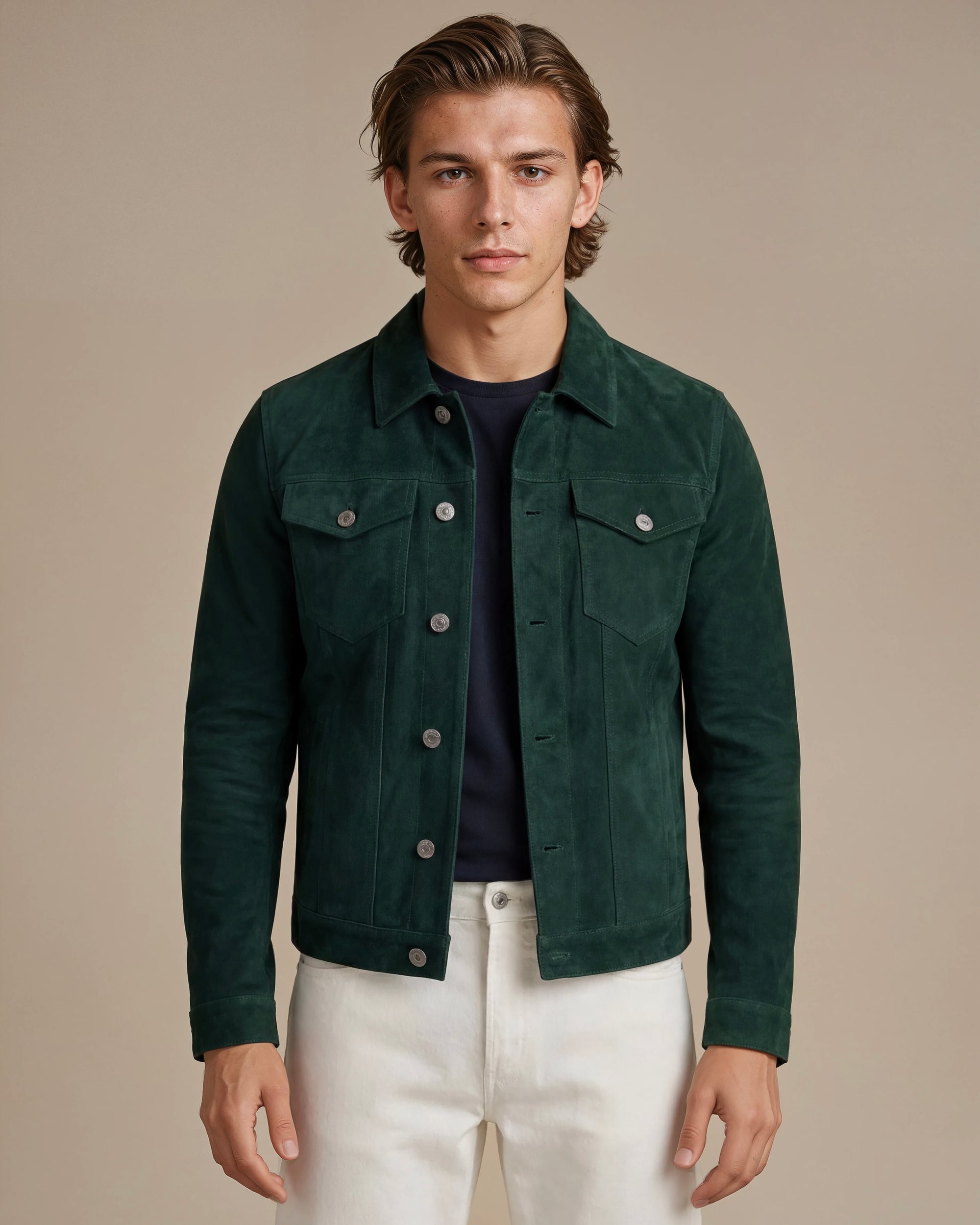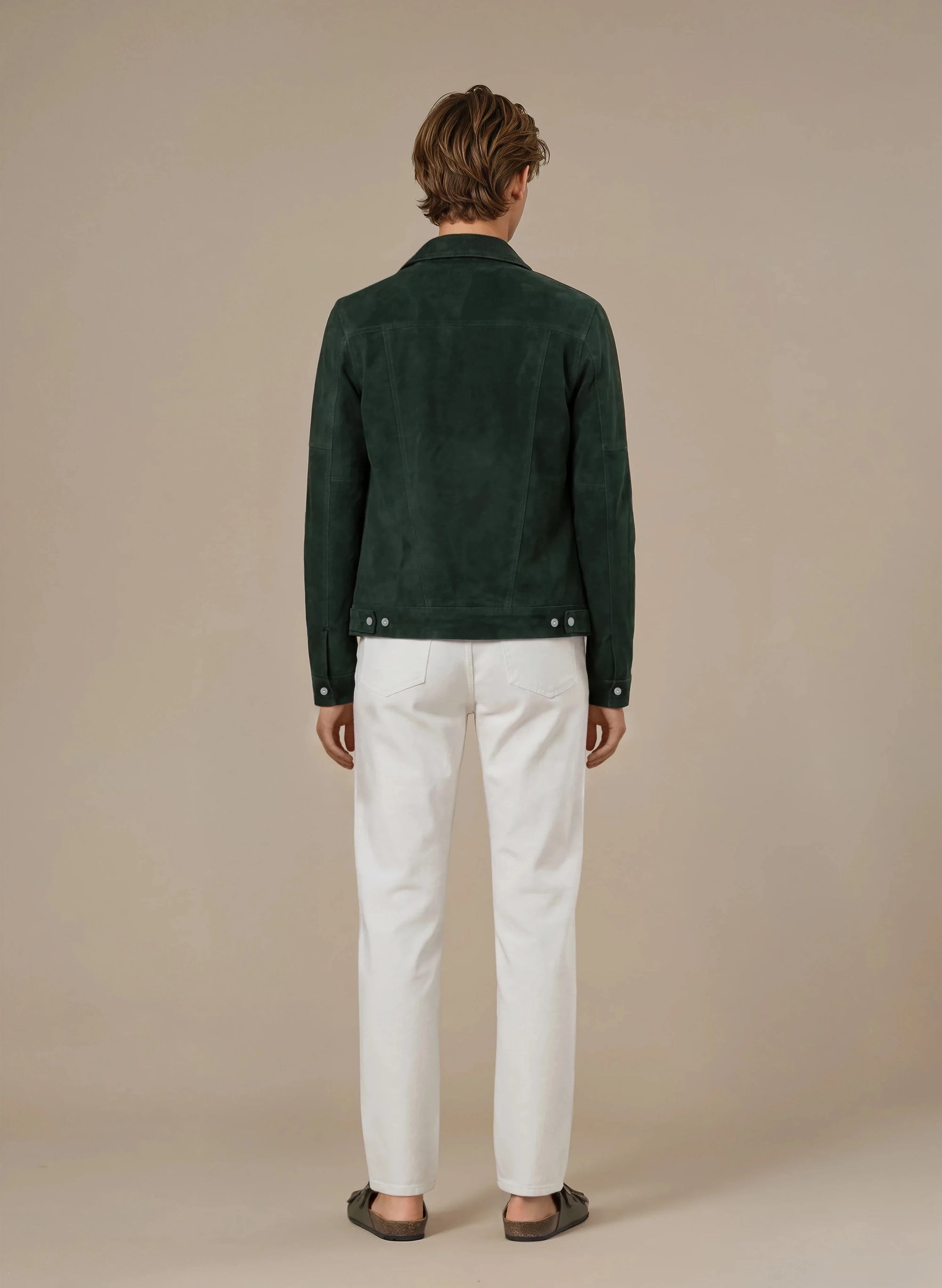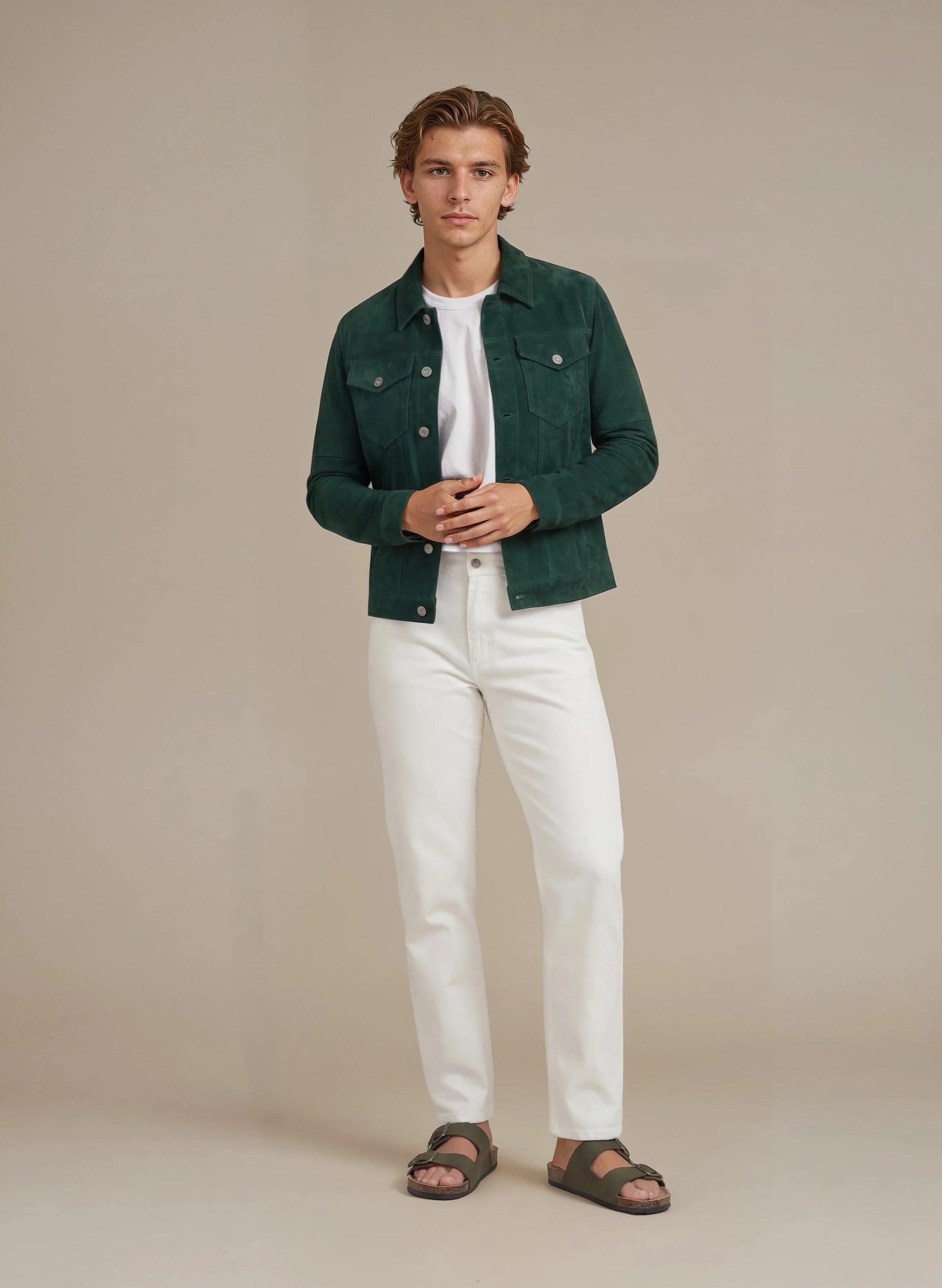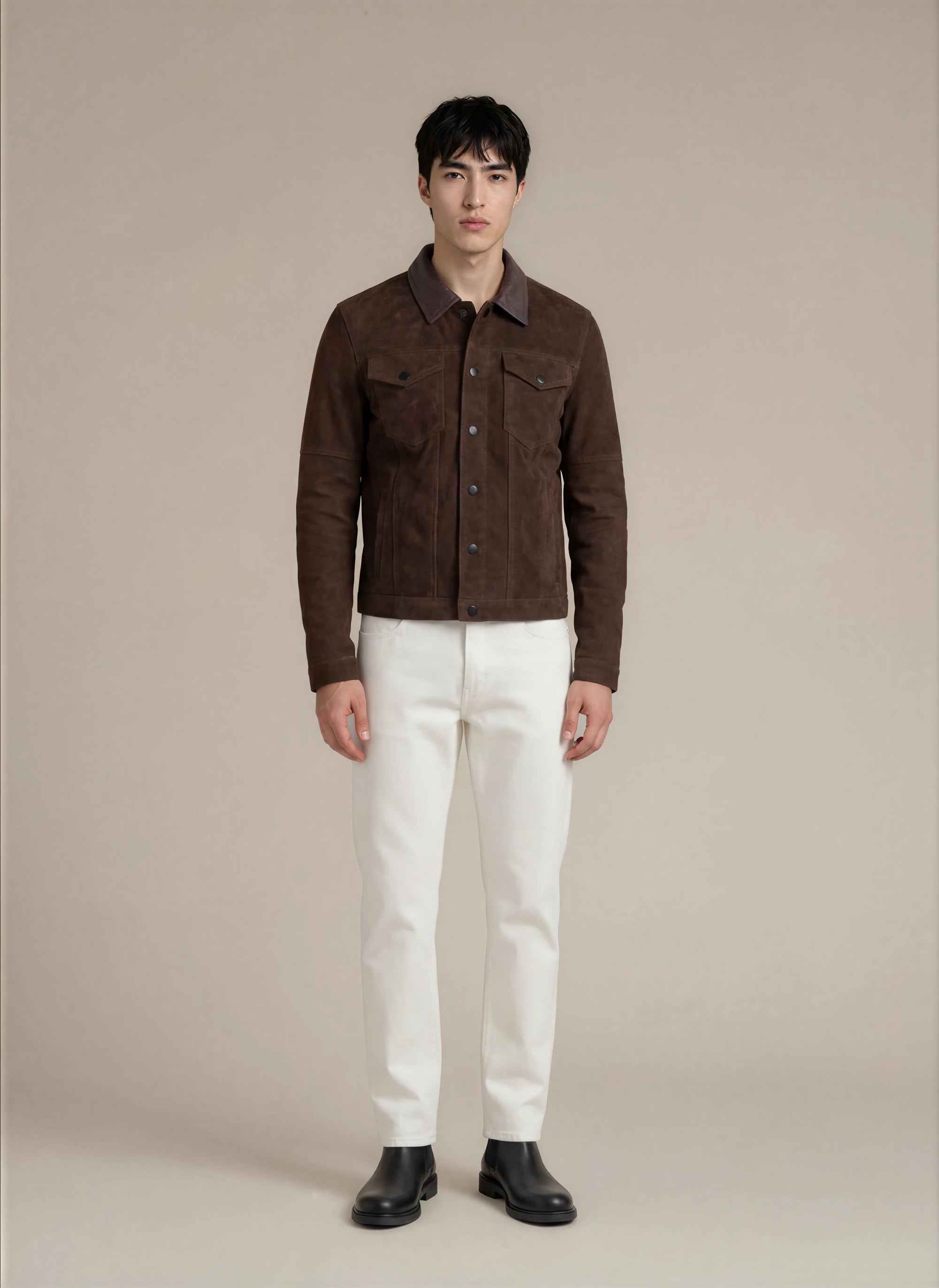 Man wearing a beige suede jacket, beige shirt and dark formal pants