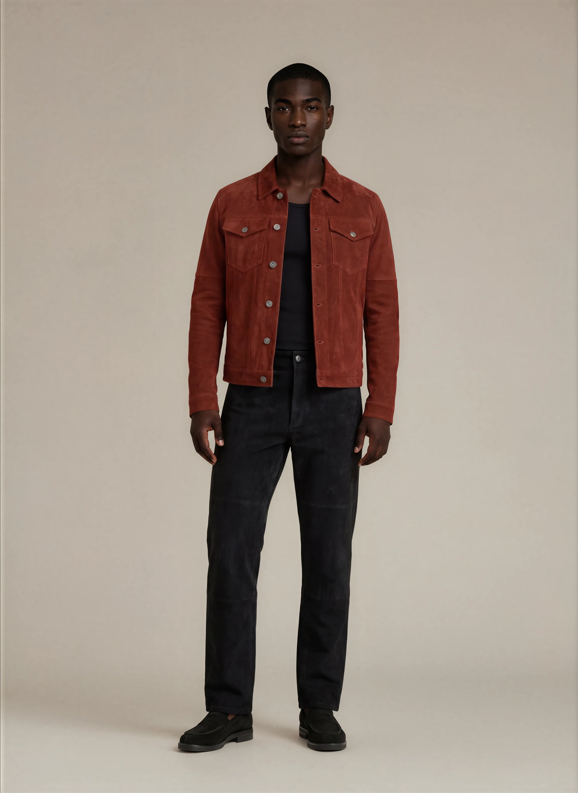 Man wearing a classic jet black goat suede trucker jacket