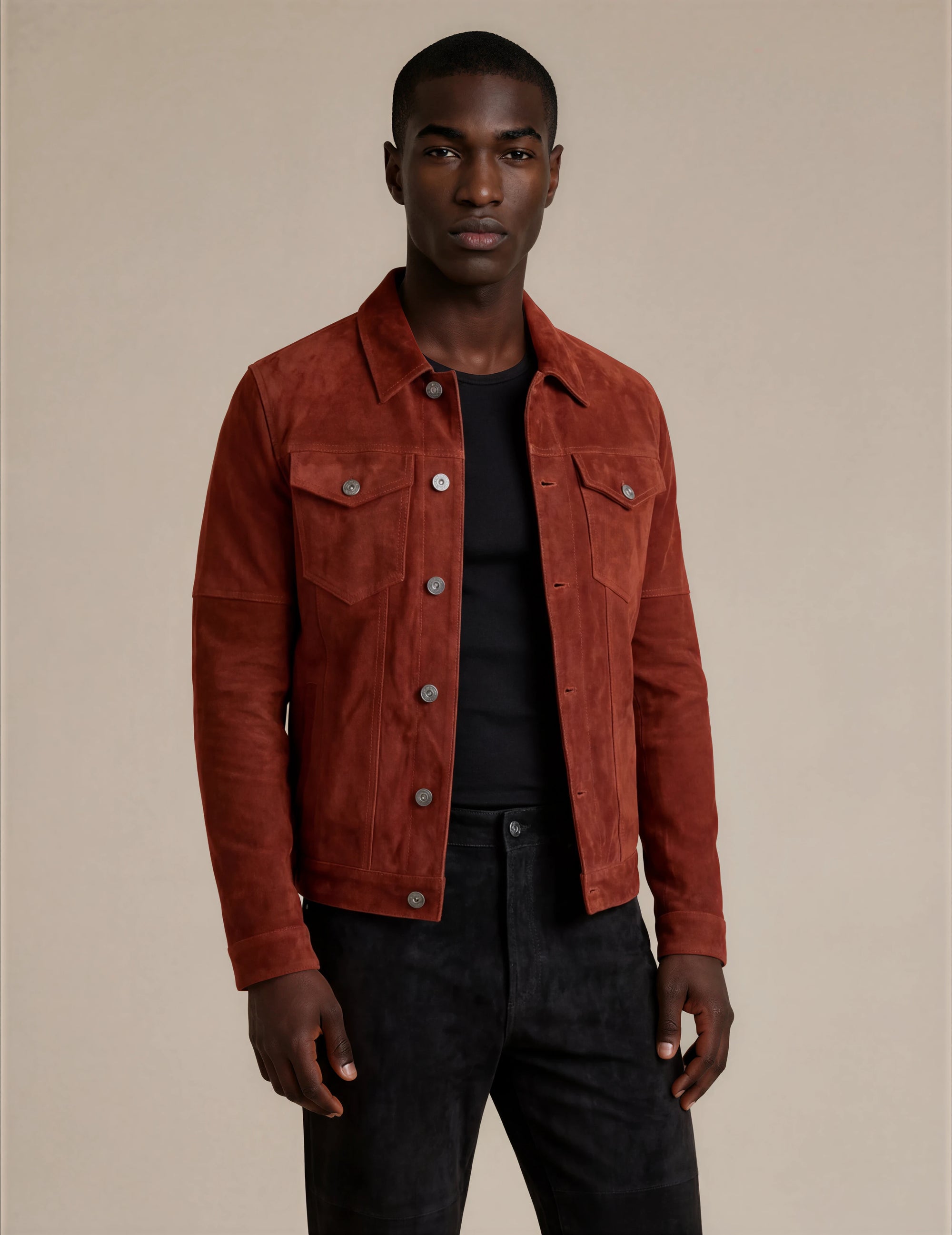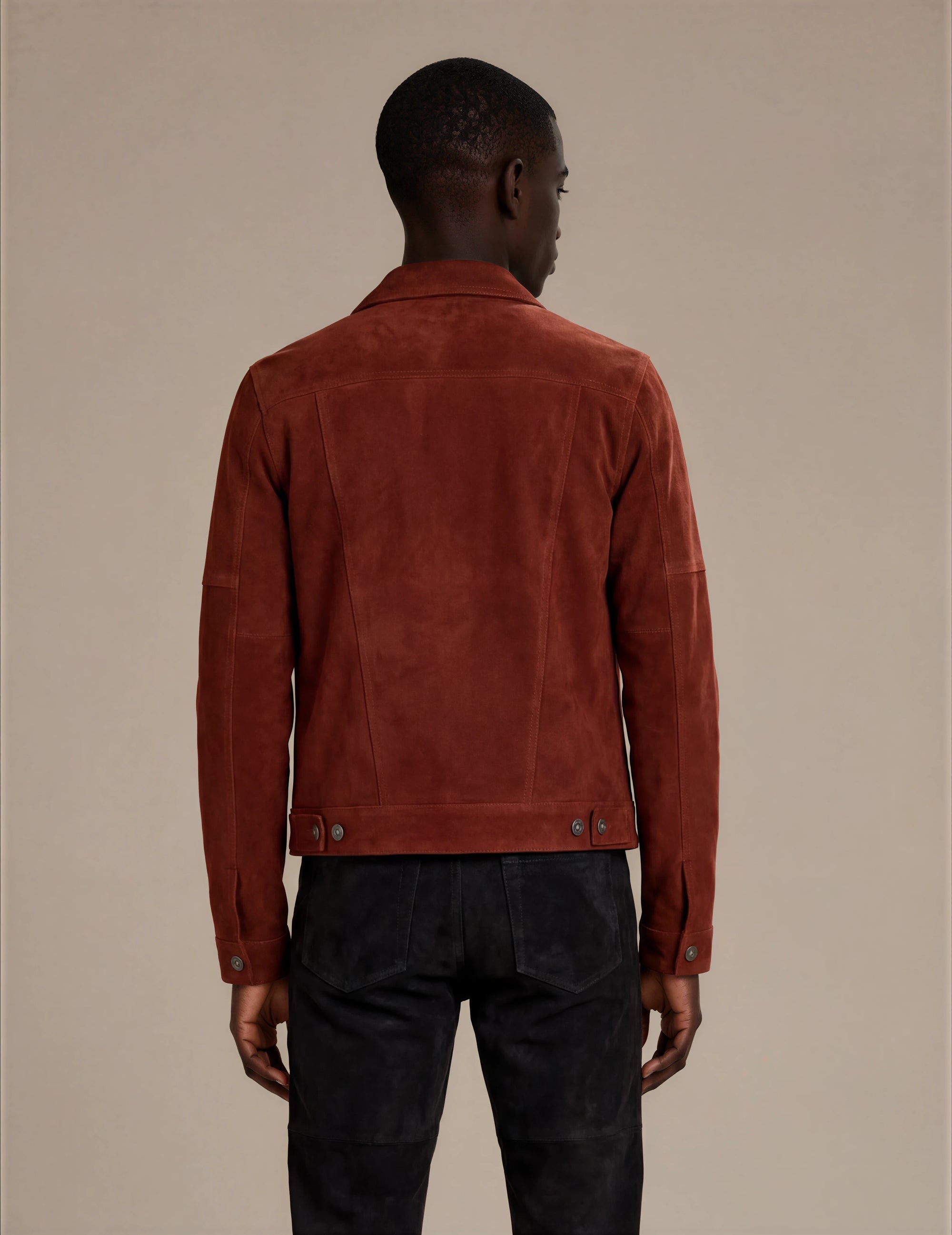 Man wearing a dark brown goat suede trucker jean jacket with snaps