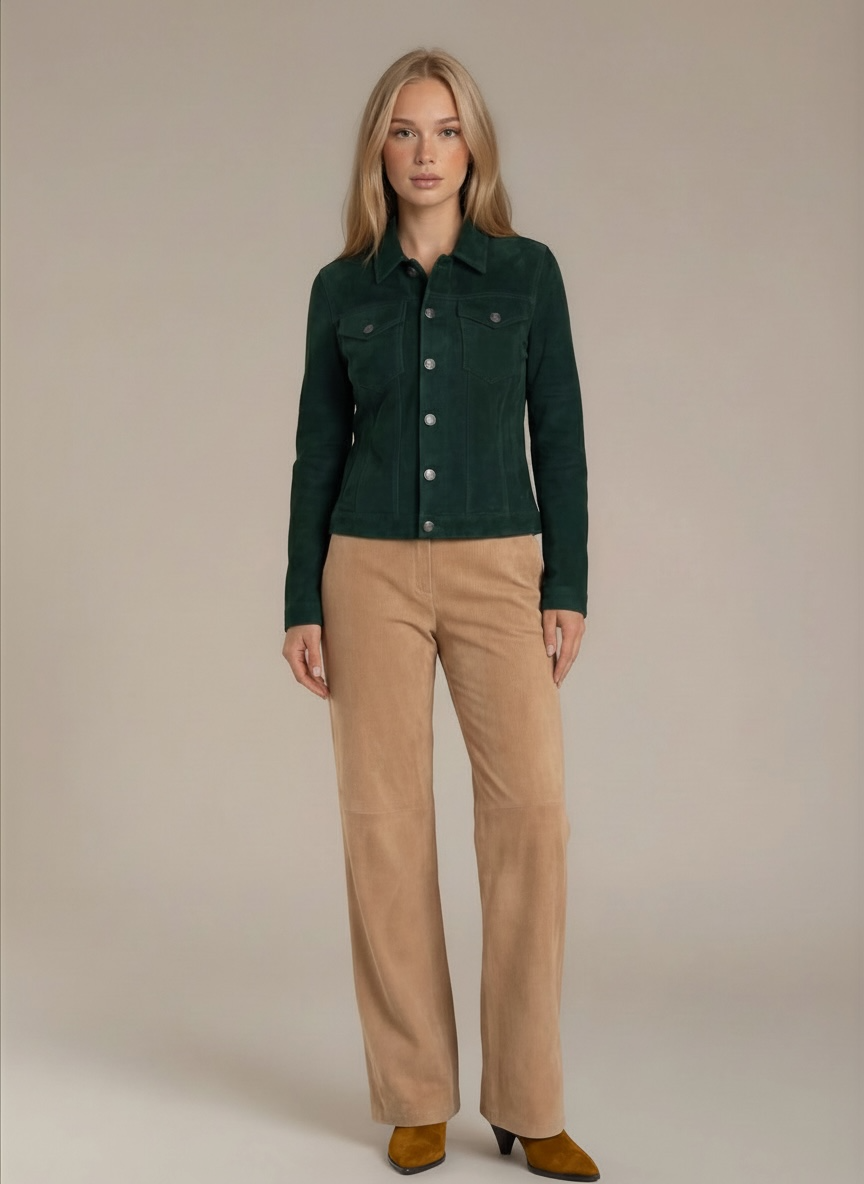 Woman wearing a brown goat suede trucker jacket with snaps buttons