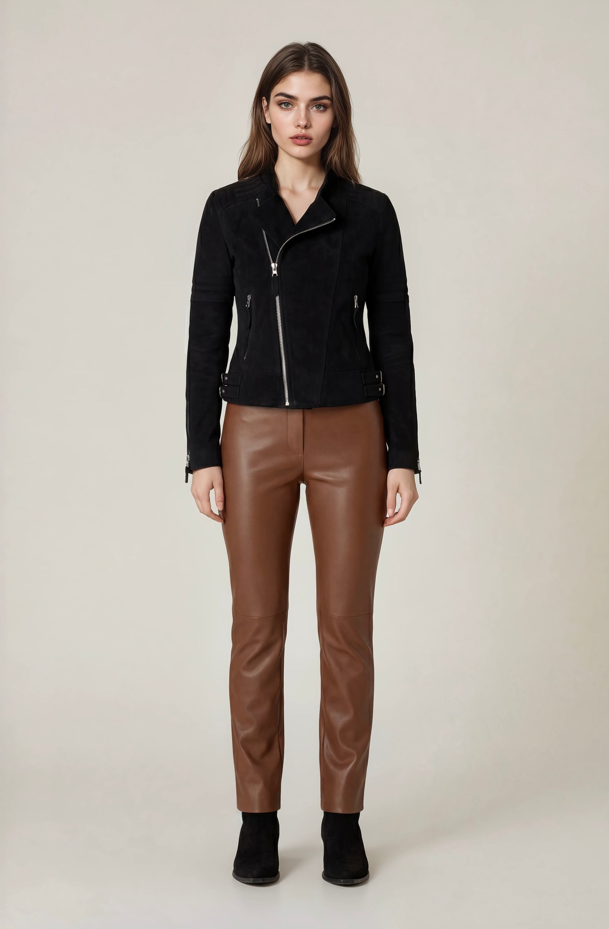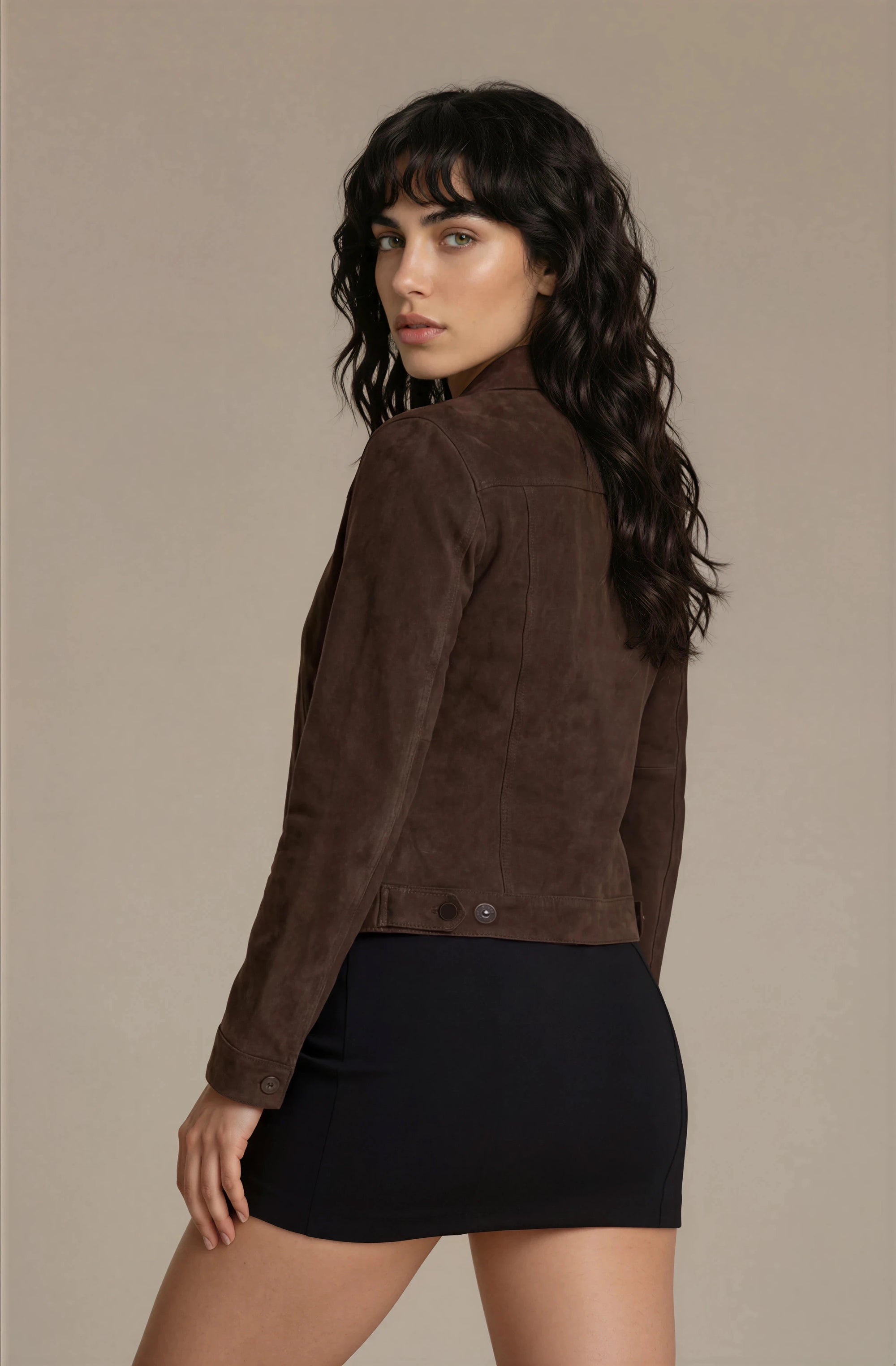 Western cowgirl woman wearing a dark brown goat suede trucker jacket