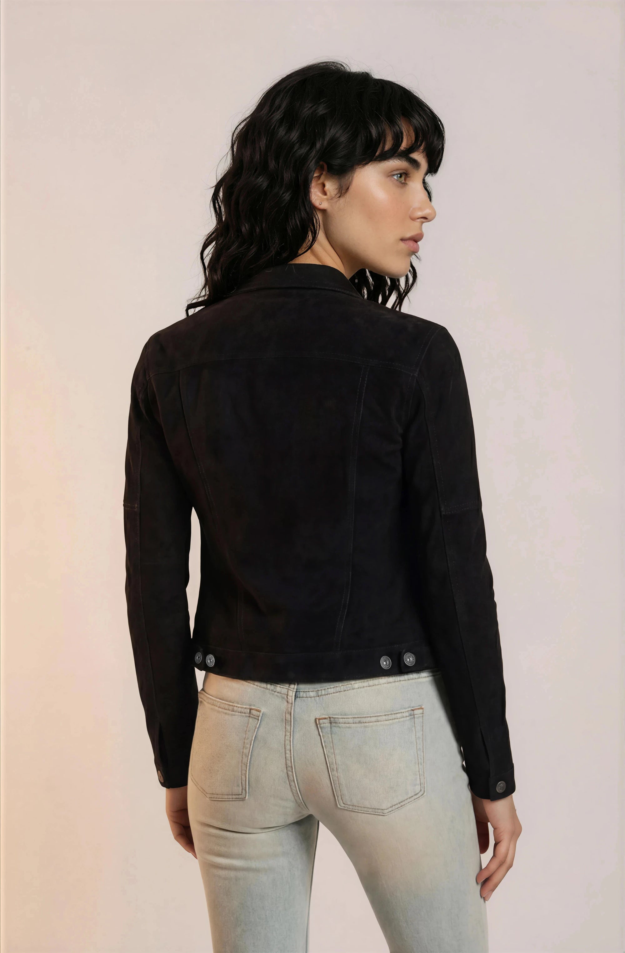 Western cowgirl woman wearing a jet black goat suede trucker jean jacket