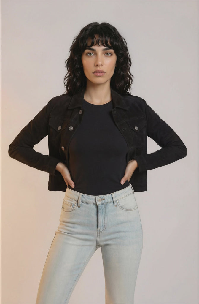 Allsuede women essential suede trucker jacket is crafted from 100% goatskin. This regular fit jean style jacket in black color delivers luxury texture, durable construction, and everyday versatility. A wardrobe staple that never goes out of style.