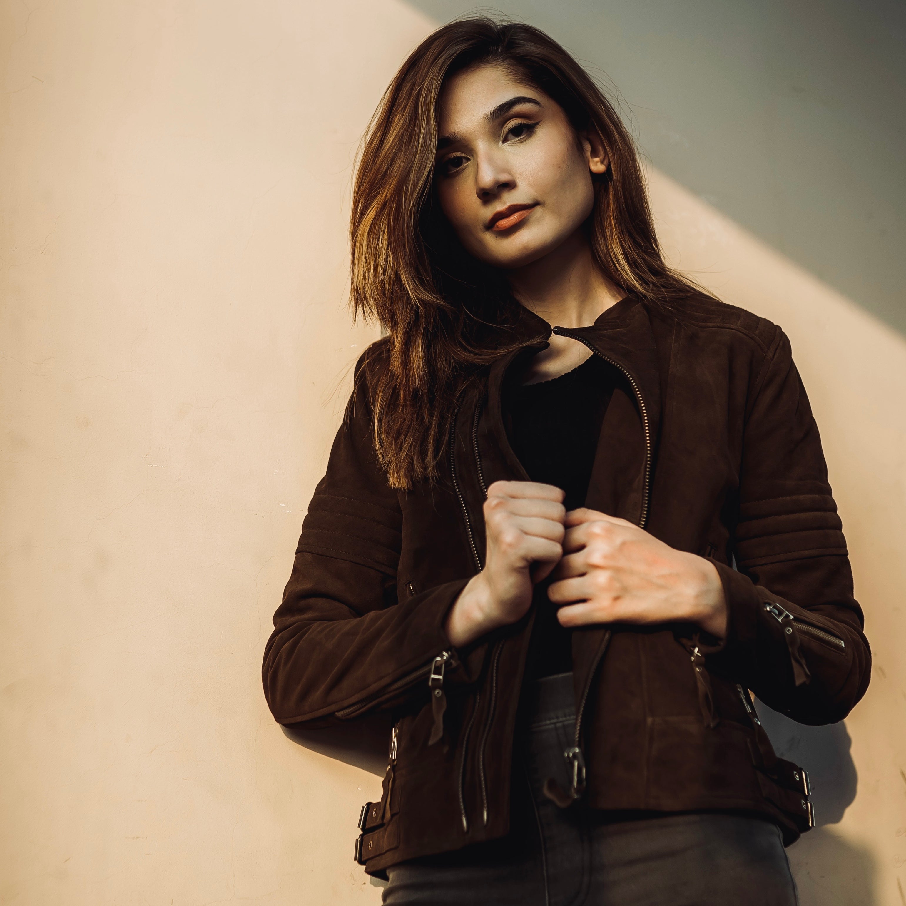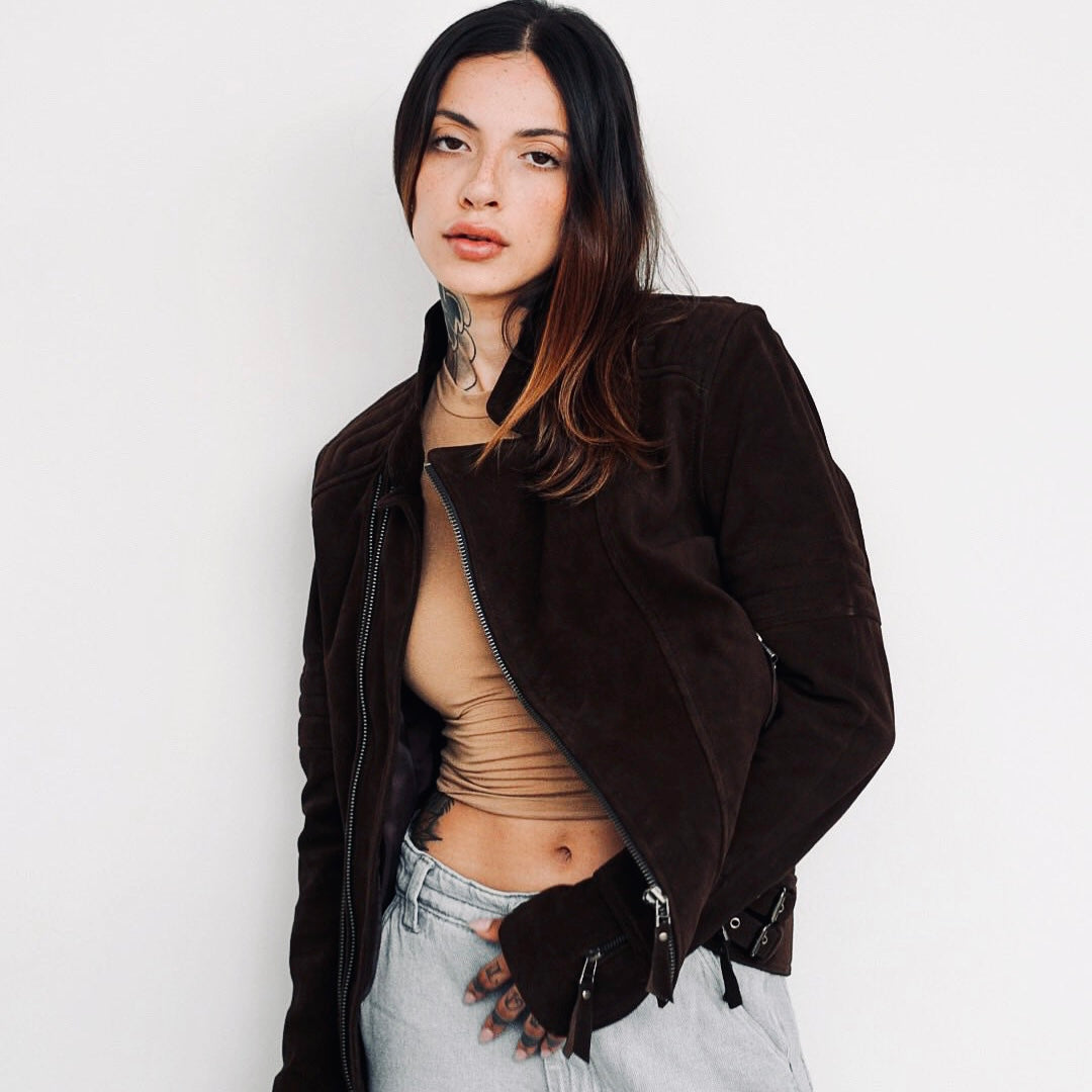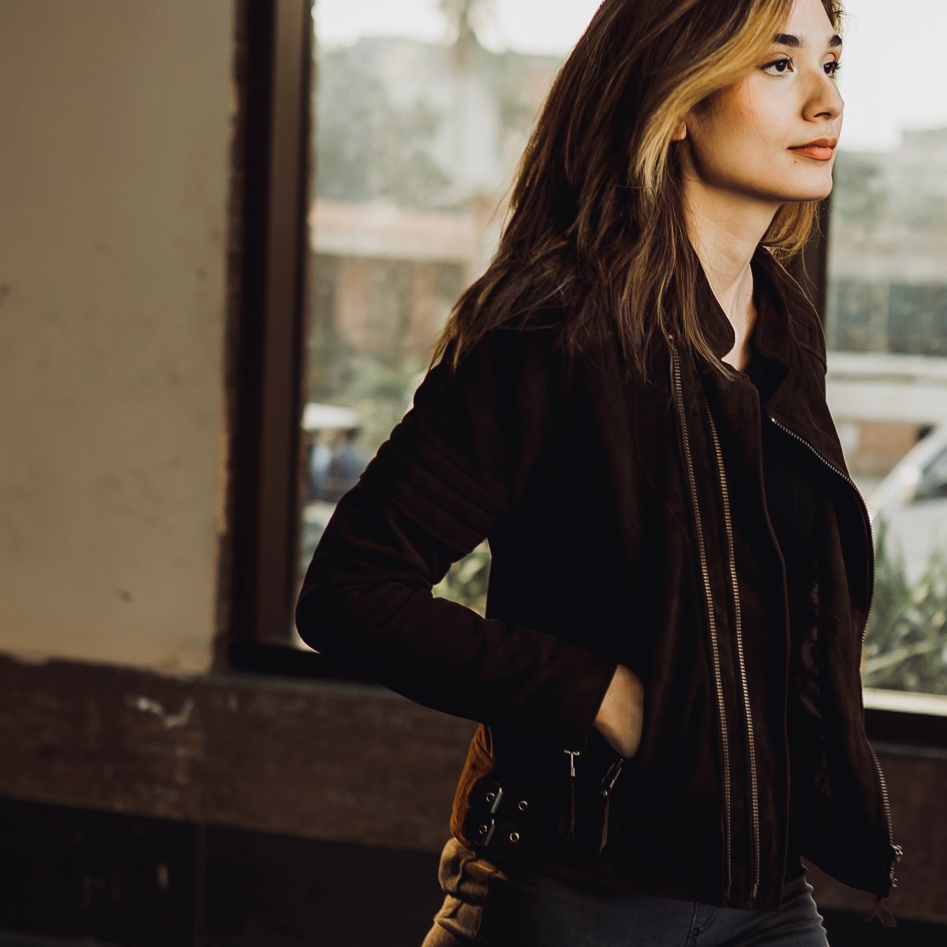 Allsuede womens suede biker style in brown color is crafted from goatskin, this jacket delivers a soft, luxurious feel with the durability you expect from premium outerwear. The tailored modern fit sharpens your silhouette, while the smooth satin lining ensures all-day comfort. Finished with premium metal hardware, every detail is designed to elevate your look.